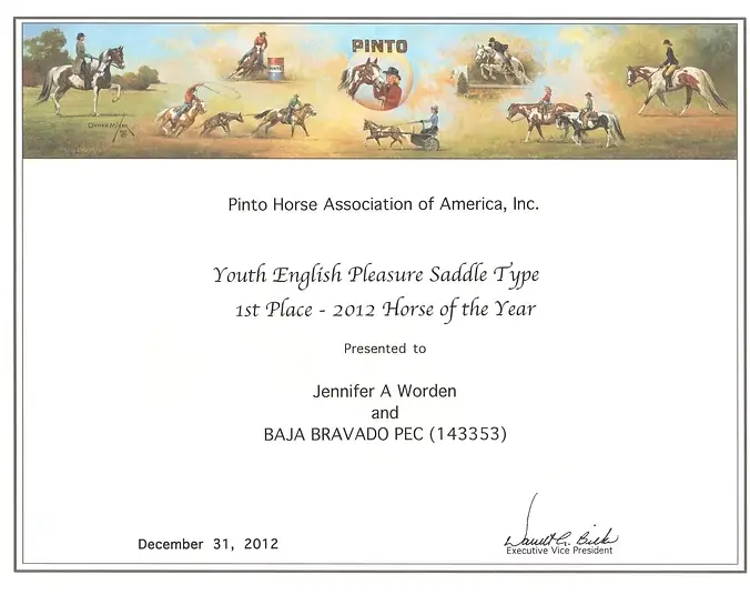 We would like to congratulate Jenna Worden and her horse Baha Brovado on winning 2012 Pinto Horse of the Year. We are very proud of you!